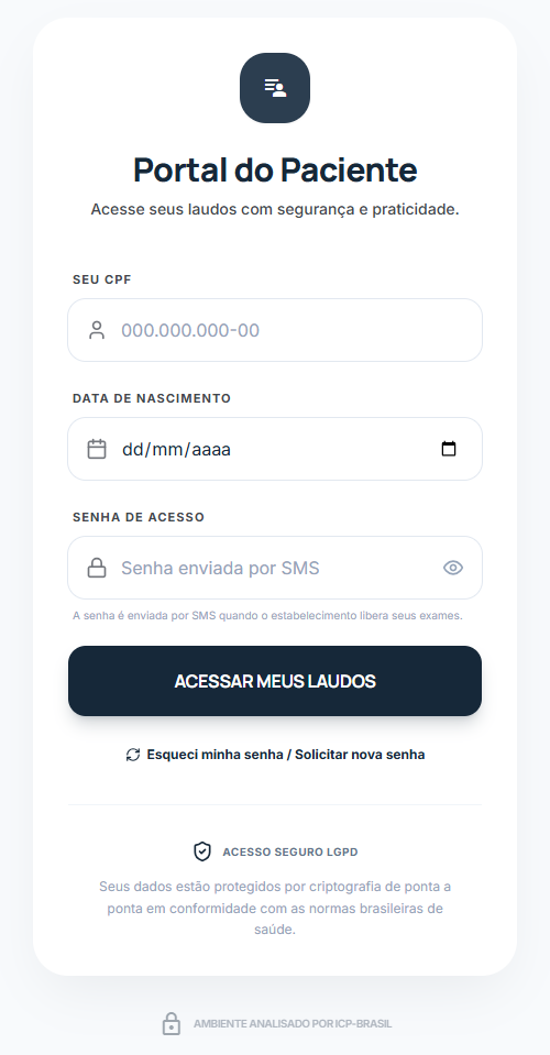 O paciente recebe um link único via WhatsApp ou SMS. Ao clicar, ele valida sua identidade (ex: data de nascimento) e acessa o laudo instantaneamente, sem precisar decorar senhas complexas.